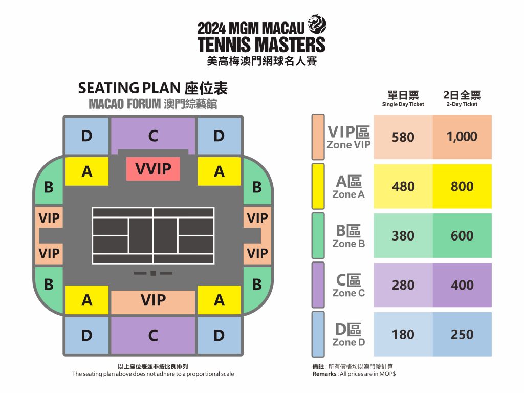- 未經美高梅澳門網球名人賽主辦單位書面許可,持票者不得將門票轉售或用於商業推廣。